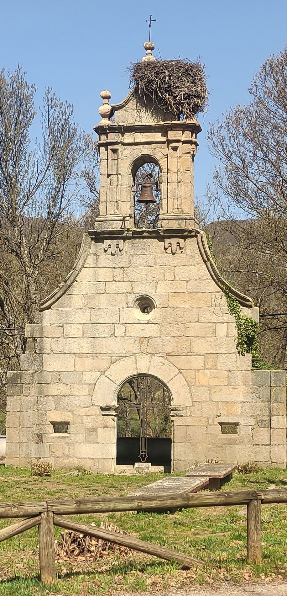 Esta portada corresponde a la fachada de la iglesia de San Juan de Ribadelago. Tras la riada la iglesia quedó prácticamente destruida por lo que, tras la edificación del nuevo pueblo, se desmontó y colocó aquí piedra a piedra